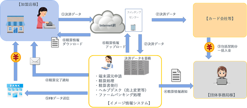 商店街振興組合、商工会議所、フランチャイズ運営企業が取り組んでいる包括加盟店事業の精算代行業務をおこなっております。